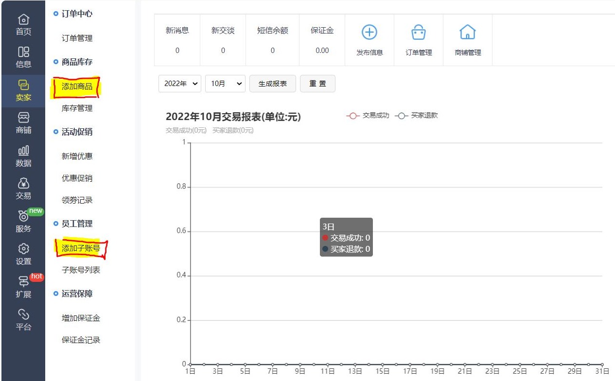 賣家后臺 : 這里是注冊用戶發(fā)布自己的產(chǎn)品消息,添加產(chǎn)品的地方,還可以在這里添加后臺管理的員工賬號。