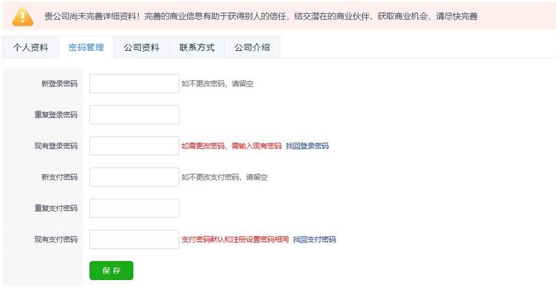 本著資料填寫的重要性,用戶的“公司資料”和“個人資料”標(biāo)簽填寫或修改完畢后,系統(tǒng)都會跳轉(zhuǎn)到“密碼管理”確認頁面。