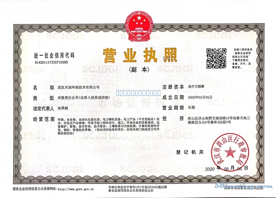 | 發(fā)證機構(gòu) | 武漢市洪山區(qū)行政審批局 | 發(fā)證時間 | 2020-06-04 |